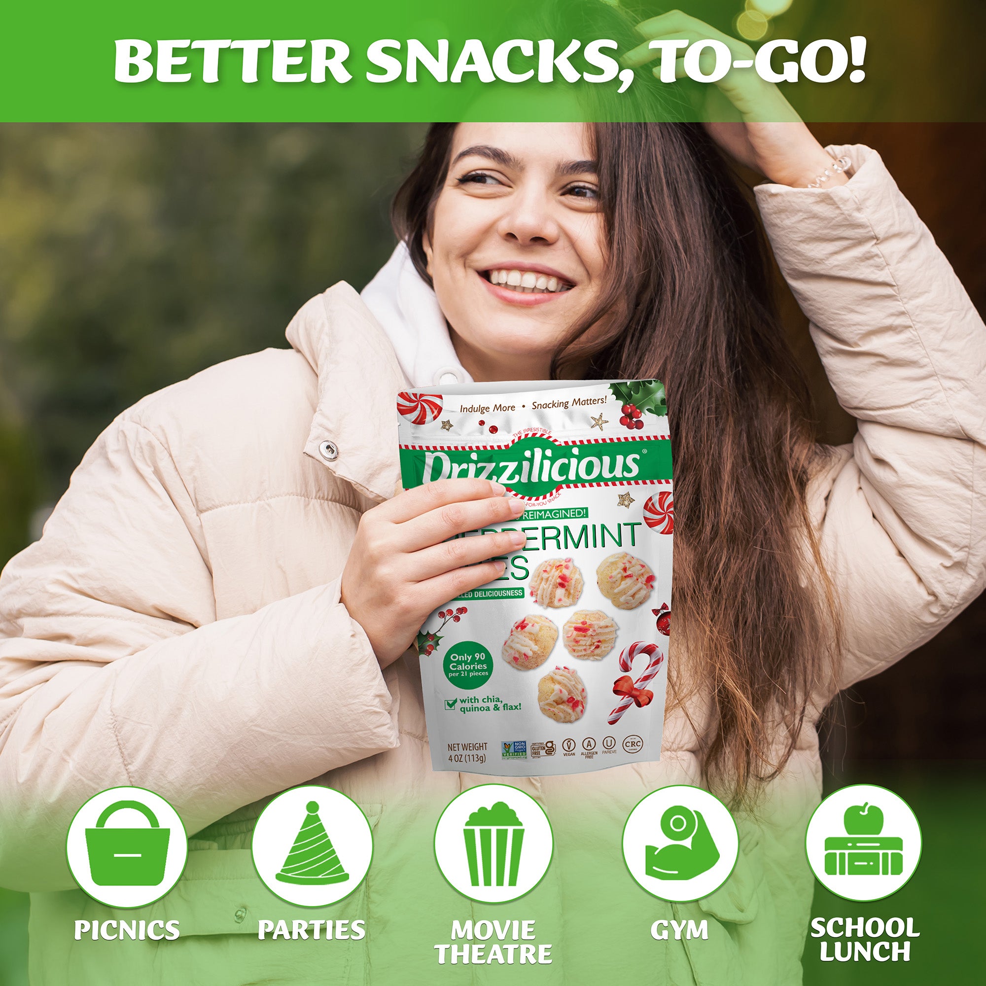 All this for only 90 calories per 21 pieces!? Drizzilicious is a smart little snack the whole family can feel merry about!