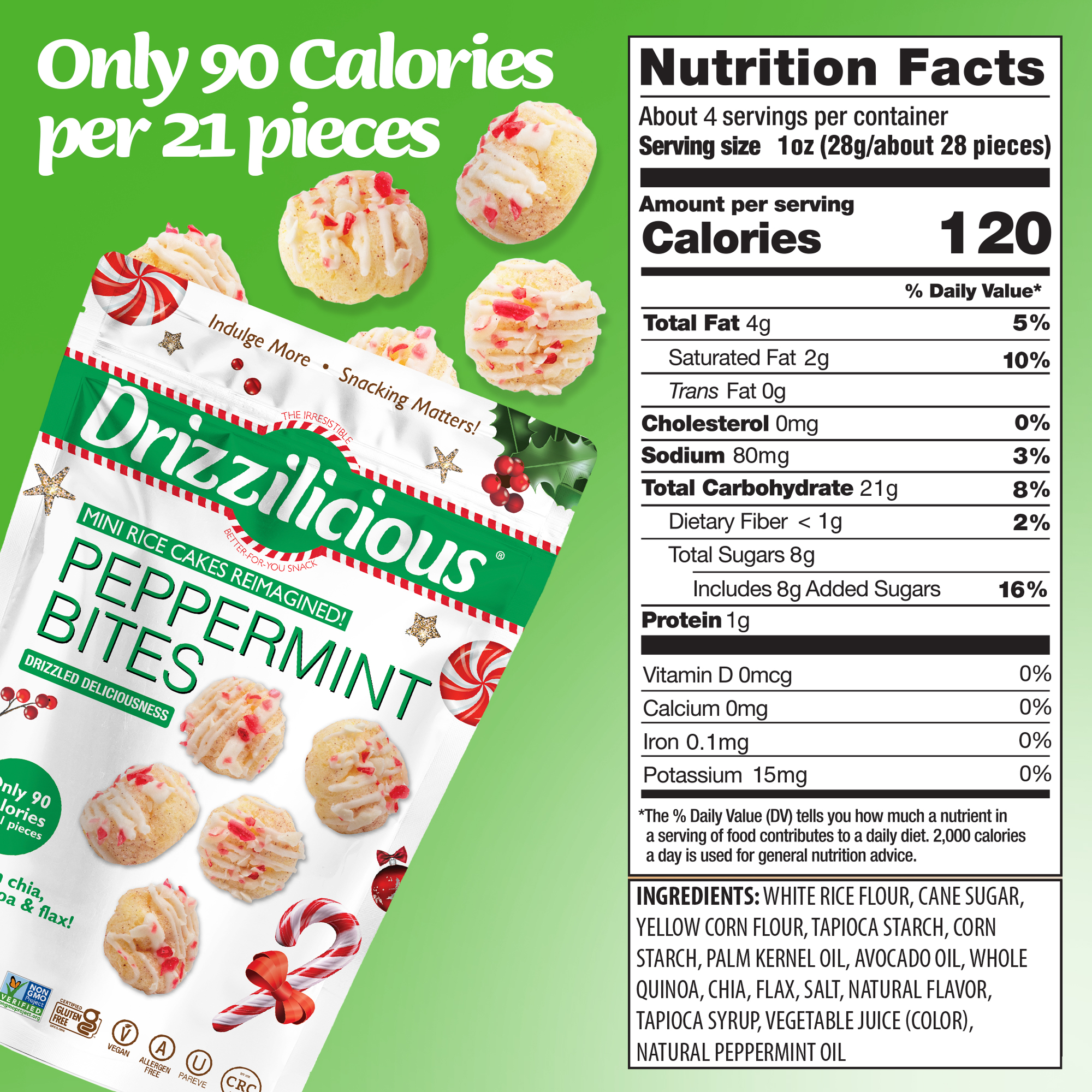 Our Drizzilicious Peppermint bites are the perfect treat to snack on for all-young or old! Cool, refreshing peppermint brings a minty-sweet blast of flavor to our crispy popped mini rice cakes! Finished with a festive drizzle, snacking has never felt so fresh!