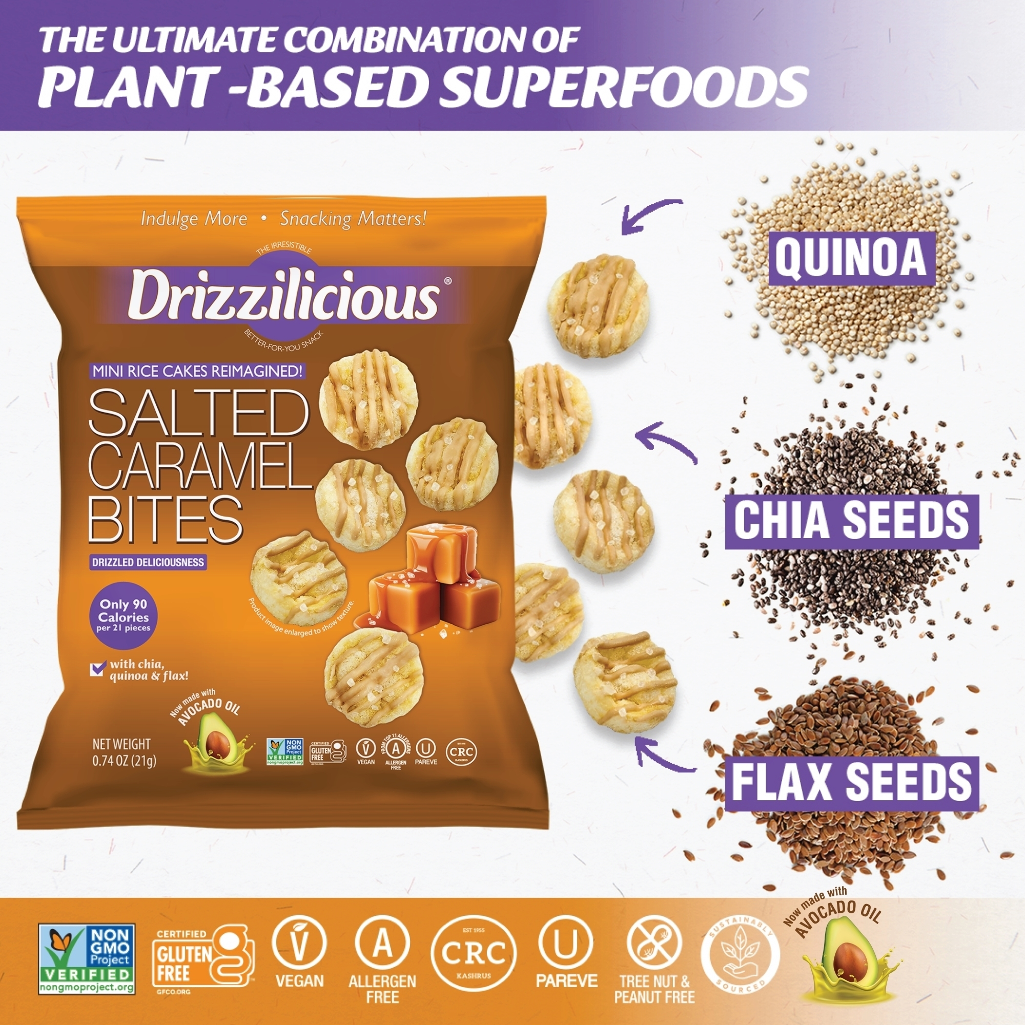 Our Drizzilicious Salted Caramel bites are mini rice cakes reimagined!